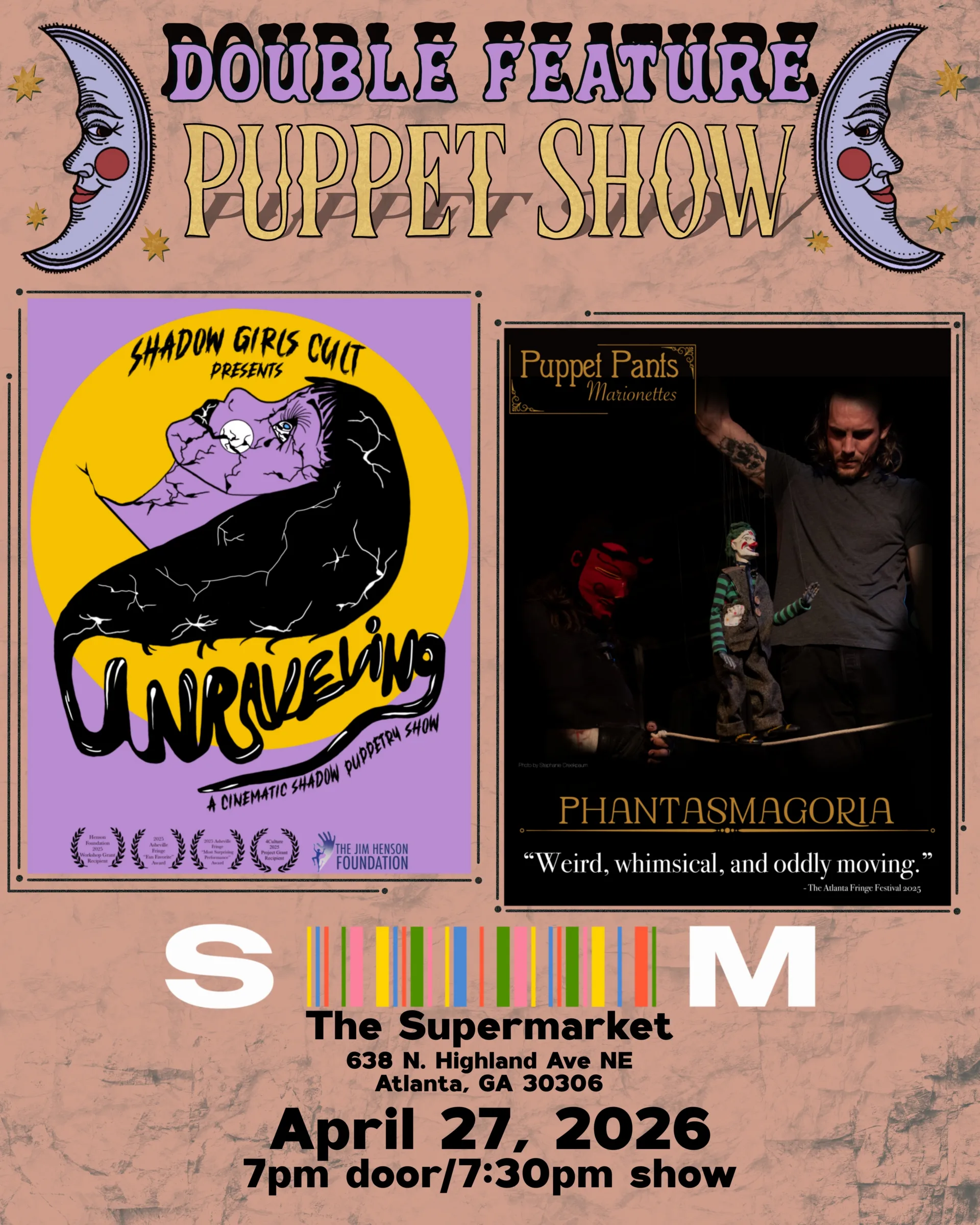 Join us for a one-night double feature of thoughtful, mind-bending, and whimsical marionettes and shadow puppetry: PHANTASMAGORIA, by one-man marionette-building extraordinaire Puppet Pants, and UNRAVELING, by Henson Grant-awarded duo Shadow Girls Cult.