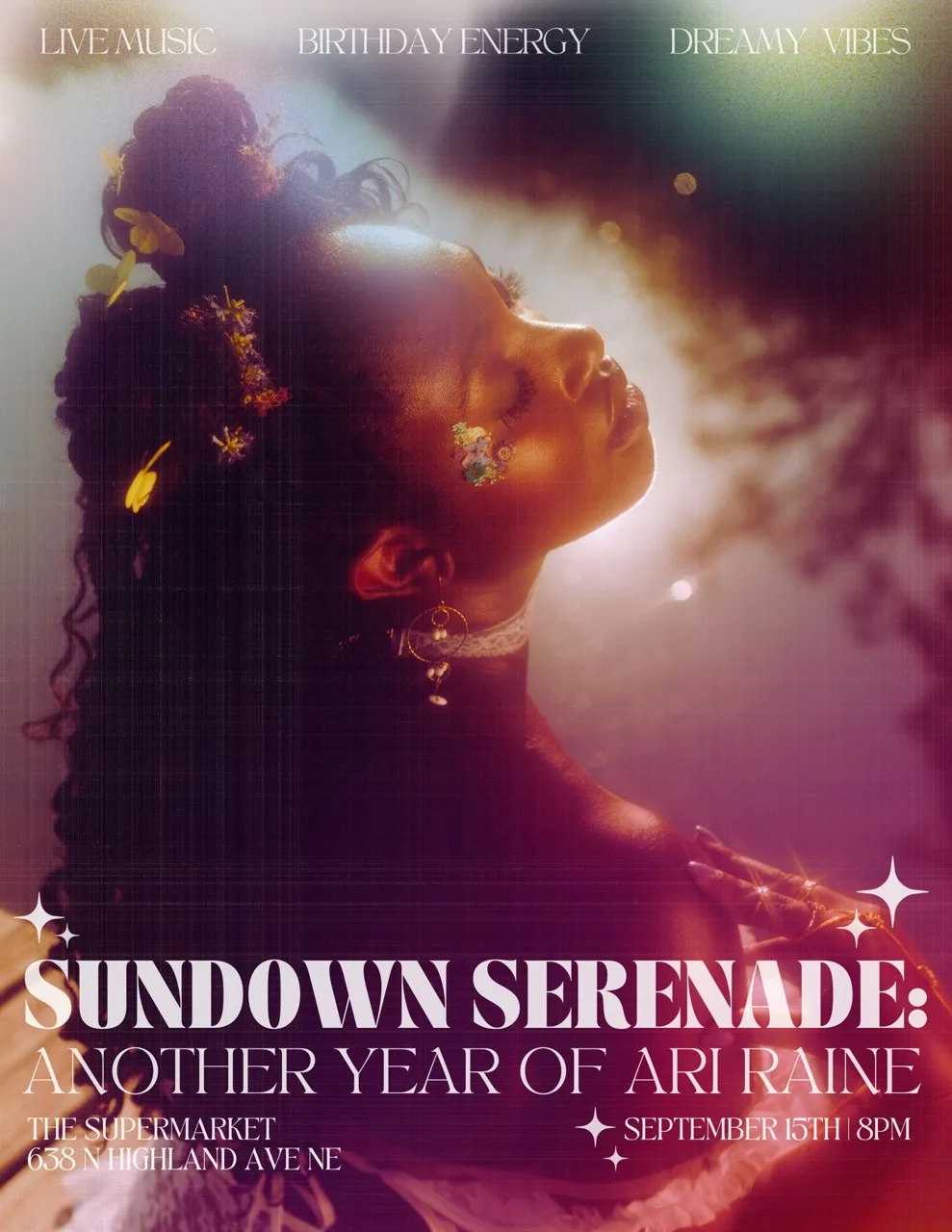 Sundown Serenade is more than a birthday—it’s a live music experience filled with soul-soaked vocals, warm grooves, and nostalgic magic. Join us on September 15th at The Supermarket for an intimate night of sound, storytelling, and soft celebration as Ari Raine shares new music, fan favorites, and a few surprises under the Atlanta sky.